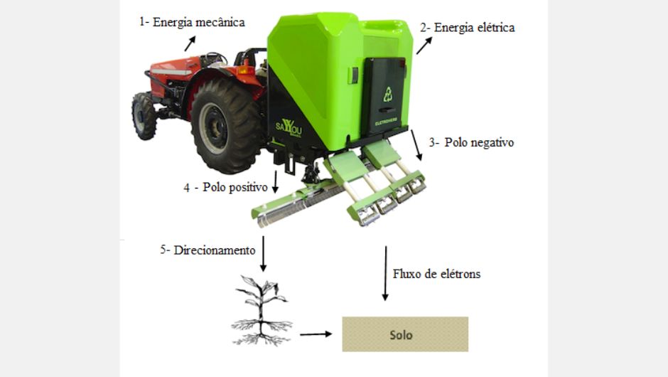 Primeiramente, a energia mecânica promovida pelo acionamento do motor do trator é convertida em energia elétrica, no implemento, criando alta voltagem e alta frequência. Essa energia é então transmitida para os aplicadores de forma que a parte negativa é transmitida para os rolos localizados à frente do implemento e que estarão em contato direto com o solo com transferência de fluxo de elétrons.