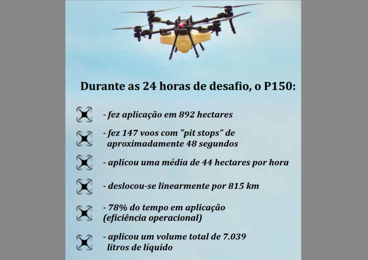 O equipamento utilizado no desafio 24 horas é o Drone modelo P150 Case IH, que é uma aeronave com motores de propulsão A55, que proporcionam potência nominal de 4.700 watts (W), configurada para duas operações distintas, a Revocast 4, que é o sistema de distribuição de produtos sólidos e pesa 58 kg, e a RevoSpray 4, que trabalha com a pulverização e pesa 54 kg. As duas versões podem carregar até 70kg de produtos, chegando a 125 kg de peso máximo, nas condições de decolagem para pulverização. O equipamento com RevoSpray 4 tem dimensões na posição de trabalho de 3.110 x 3.118 x 764 mm e pode ser acondicionado para transporte, resultando em menores dimensões de 1.072 x 1.102 x 788 mm, articulando-se as hélices e os braços, podendo ser transportado em uma caminhonete de pequeno porte. Para os que não estão acostumados, chega a impressionar o tamanho e seu funcionamento. O depósito de produto tem capacidade máxima para 70 litros e a aeronave é dotada de dois bicos atomizadores, acionados por bombas rotativas flexíveis, que giram a uma rotação que vai desde os 1.500 rpm até um máximo de 16.000 rpm. O leque de pulverização, que depende da altura de voo, vai dos 5 m aos 10 m. As bombas individualmente trabalham com vazão de 0,5 a 15 l/min, o que pode gerar uma vazão total de até 30 l/min. As informações sobre qualidade de aplicação indicam um tamanho variável de gota desde 60 a 400 micrômetros (µm). A distância máxima de voo ininterrupto é de 2.000 m, a velocidade máxima de voo em aplicação é de 65 km/h e a altura máxima de 30 m.