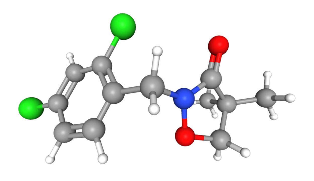 Classe química: herbicidas isoxazolidinonas (pertence à família das isoxazolidinas, com estrutura química que inclui um anel isoxazolidinona substituído por grupos clorados e metil).