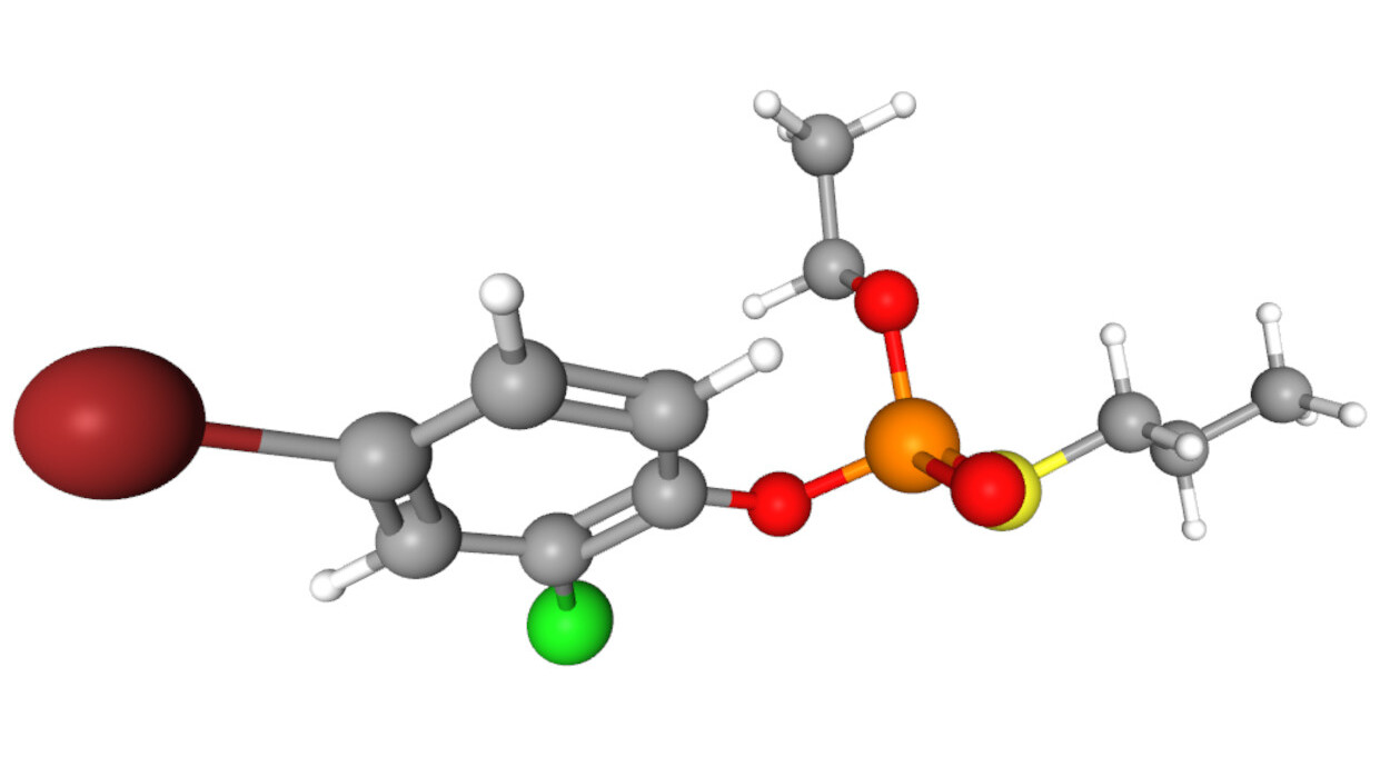 Modo de ação: profenofos é um inibidor da enzima acetilcolinesterase (AChE), classificada na classe 1B pelo IRAC (Insecticide Resistance Action Committee). Atua por contato e ingestão, não sendo sistêmico, e penetra diretamente na cutícula dos insetos, afetando o sistema nervoso central ao impedir a degradação da acetilcolina. É usado como uma mistura racêmica, mas o isômero S(-) é mais potente. Exibe estereoisomerismo devido ao átomo de fósforo quiral. Resistência foi registrada em pragas como Bemisia tabaci, Spodoptera littoralis e Tetranychus urticae.