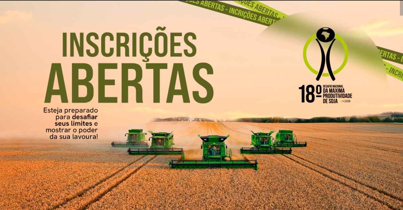 Estão abertas as inscrições para o 18º Desafio Nacional de Máxima Produtividade da Soja (Safra 2025/26). A promoção é do Comitê Estratégico Soja Brasil (Cesb). Produtores interessados em participar devem preencher os formulários no site da instituição até o dia 31 de janeiro de 2026.