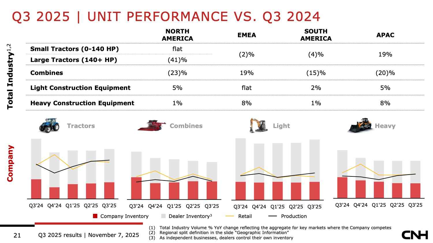 A receita com máquinas agrícolas caiu 10%, para US$ 2,96 bilhões, pressionada pela redução nas entregas na América do Norte, pela desaceleração da demanda global e pelo esforço de destoque da rede. Tratores acima de 140 cv recuaram 41% na América do Norte, enquanto colhedoras tiveram queda de 23%. No entanto, a demanda por tratores cresceu 19% na Ásia-Pacífico, e colheitadeiras subiram 19% na região EMEA (Europa, Oriente Médio e África).