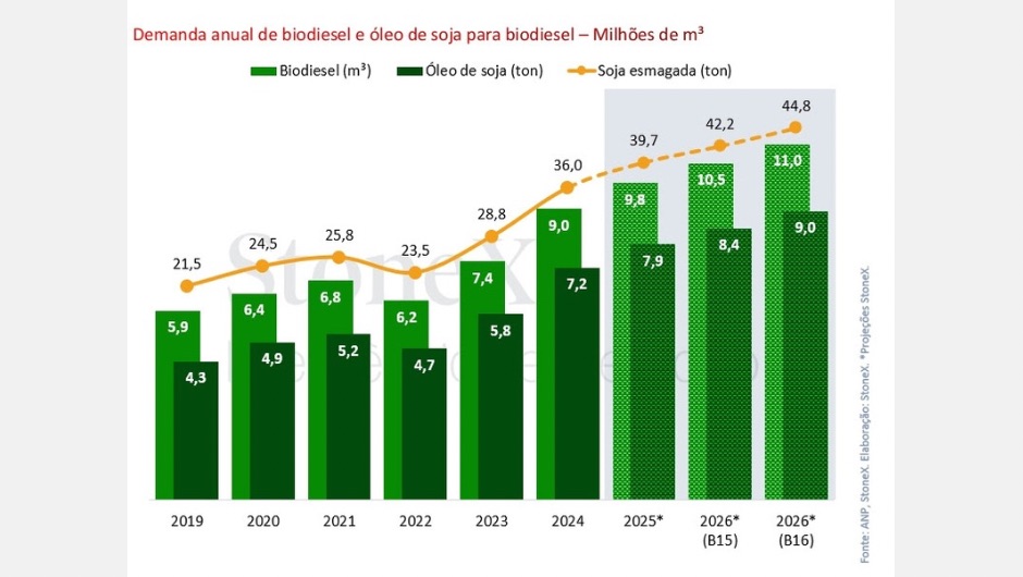Adicionalmente, apesar de o cenário base considerado pela StoneX ser o de B15 durante o ano todo, a consultoria também projetou um cenário alternativo, considerando um aumento para um B16 a partir de março. Nesse caso, o biodiesel marcaria uma alta anual de 12,3% para 11 milhões de m³ consumidos, enquanto o consumo do óleo de soja poderia crescer 1 milhão de toneladas frente a 2025, atingindo 9,0 milhões de toneladas.