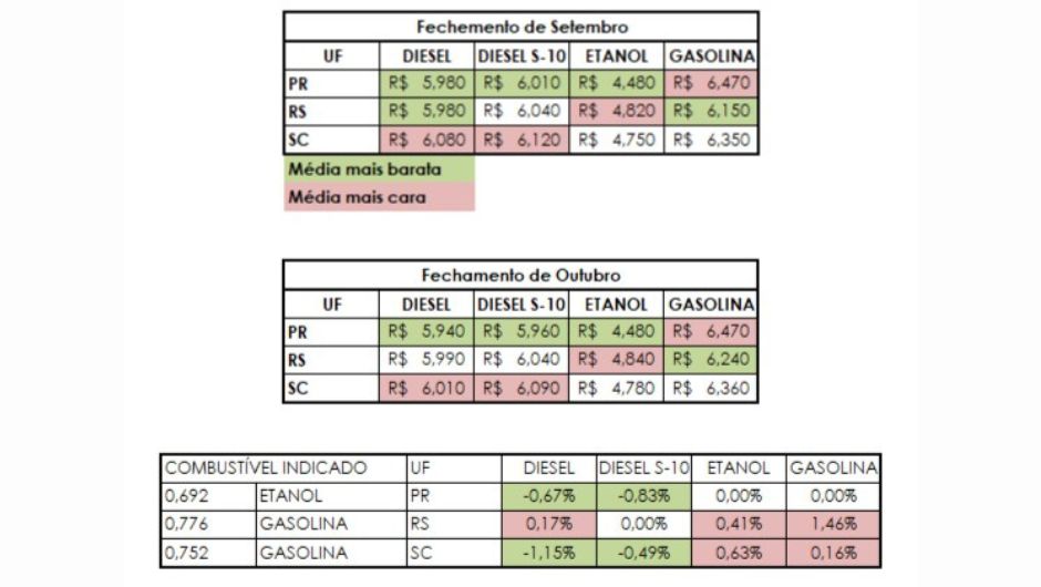 Dados da última análise do Índice de Preços Edenred Ticket Log (IPTL), levantamento que consolida o comportamento de preços das transações nos postos de combustível, apontaram que, em outubro, os preços apresentaram comportamentos mistos no Sul, na comparação com setembro.
