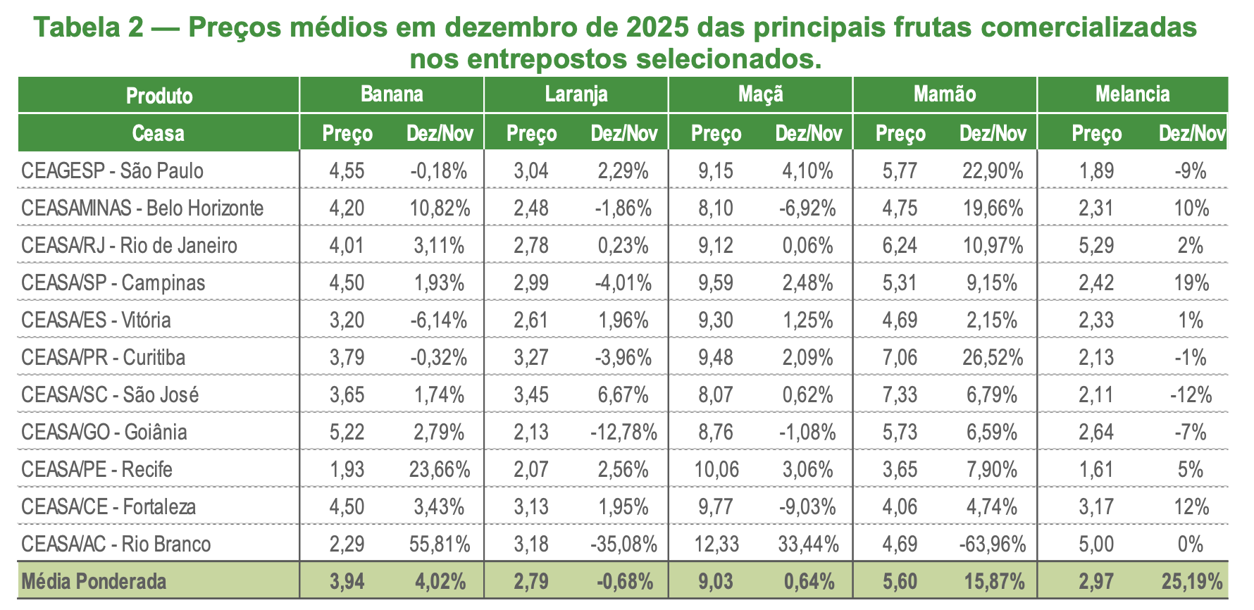 As demais frutas tiveram aumento de preços em dezembro. A banana subiu 4,02%, influenciada pela menor oferta sazonal no Nordeste e Sudeste e pela melhora da qualidade. O mamão avançou 15,87%, diante da menor disponibilidade de frutas com padrão superior. A melancia registrou alta expressiva de 25,19%, sustentada pela boa qualidade e pelas temperaturas elevadas, que estimularam o consumo na primeira quinzena do mês.