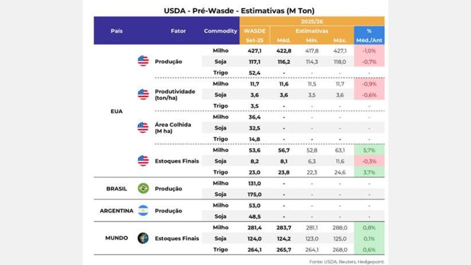 “Para tais estimativas, lembramos que o relatório de outubro costuma trazer os dados consolidados de 'fechamento' da safra 2024/25 de soja e milho dos EUA, contemplando os números indicados no relatório trimestral de estoques, divulgado pelo USDA no dia 30 de setembro. Naturalmente, os estoques finais da temporada 2024/25 se tornam os estoques iniciais da temporada 2025/26, podendo trazer alterações importantes para os quadros da nova temporada”, explica Luiz Fernando Roque, Coordenador de Inteligência de Mercado da Hedgepoint Global Markets.