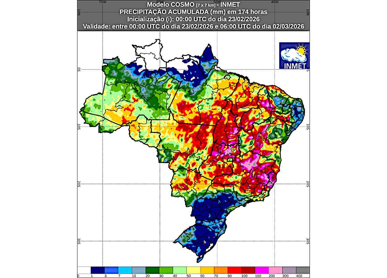 A previsão de chuva acumulada entre os dias 24 de fevereiro a 2 de março de 2026 indica que os maiores totais de chuva na semana são previstos para o centro-norte do país, estendendo-se para Minas Gerais e Espírito Santo, devido a atuação de um canal de umidade ao longo desta semana.