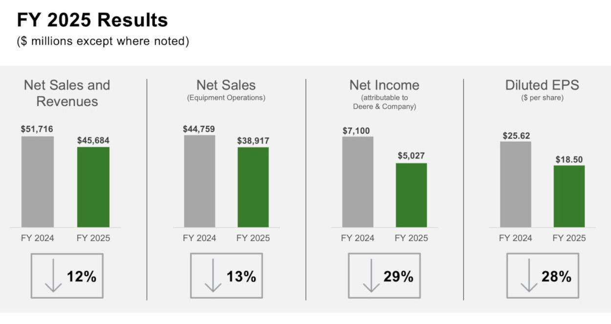 Deere & Company encerrou o ano fiscal de 2025 com lucro líquido de US$ 5,027 bilhões. O resultado caiu 29% em relação aos US$ 7,1 bilhões obtidos em 2024. A receita global diminuiu 12% no ano, para US$ 45,684 bilhões, frente aos US$ 51,716 bilhões do exercício anterior. As vendas de máquinas recuaram 13%, para US$ 38,917 bilhões.
