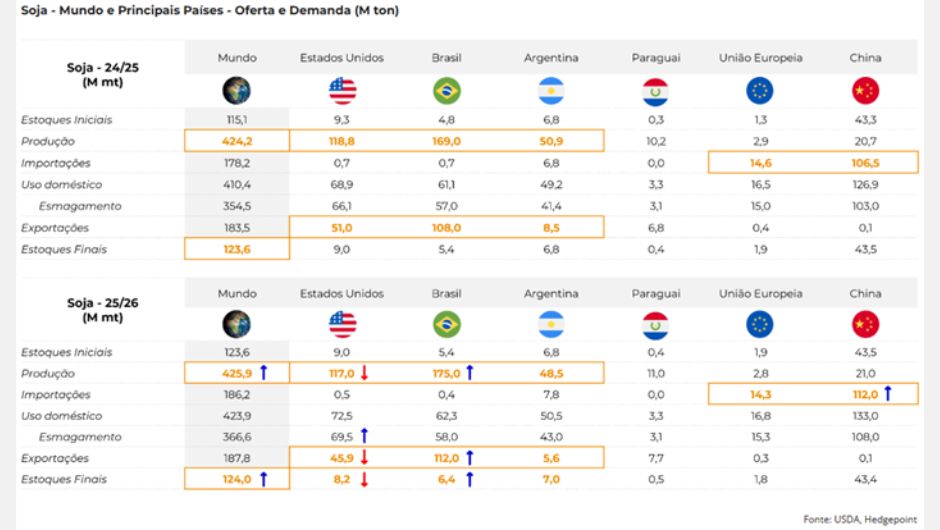 Safra 2025/26: projeção inicial da Hedgepoint aponta para uma produção de 178 M ton, o que pode representar um novo recorde. A atenção recai sobre os possíveis efeitos da La Niña no Sul do país.