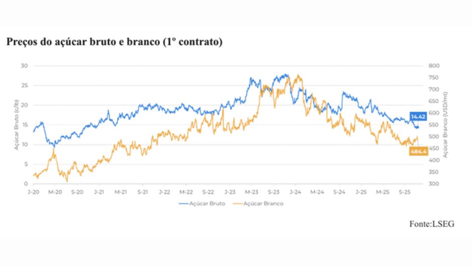 Os preços do açúcar estão em tendência de baixa nos últimos meses, experimentando uma queda acentuada entre outubro e novembro. O contrato bruto março/26 atingiu seu nível mais baixo em cinco anos nos últimos dias, em 14,04 c/lb, enquanto o contrato branco dezembro/25 atingiu os níveis de 406 USD/Mt na segunda-feira (10), o menor patamar desde dezembro de 2020.