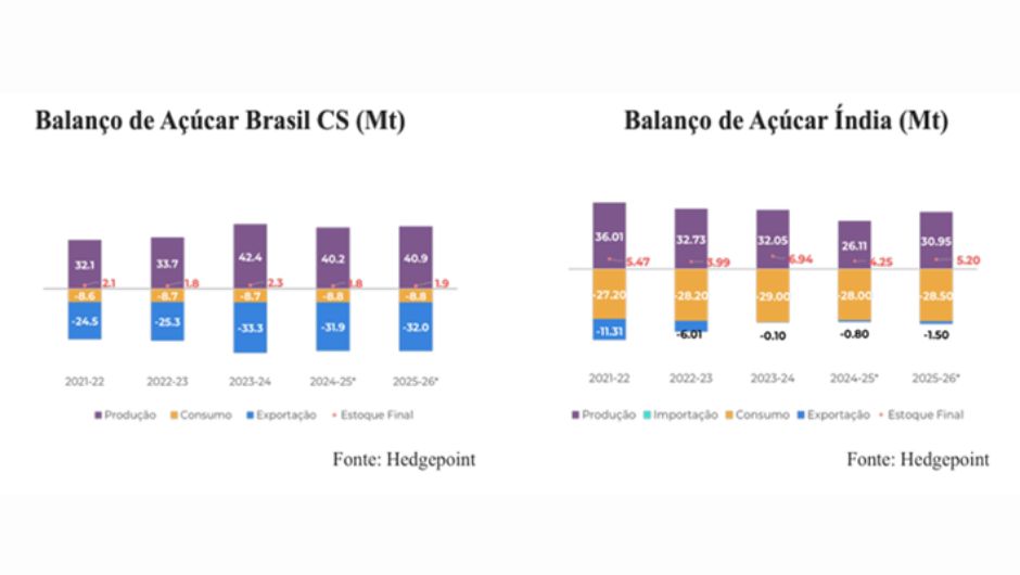 “Assim, projetamos uma oferta robusta de açúcar, algo que já se reflete no fluxo comercial do adoçante, com o aumento da disponibilidade de outras fontes, como a Índia, provavelmente compensando as restrições decorrentes da entressafra brasileira nos próximos meses. Como tal, o consenso de mercado aponta para um cenário de excedente no ciclo 25/26, o que tende a limitar ganhos significativos de preços, considerando o contexto atual”, pondera Carolina.
