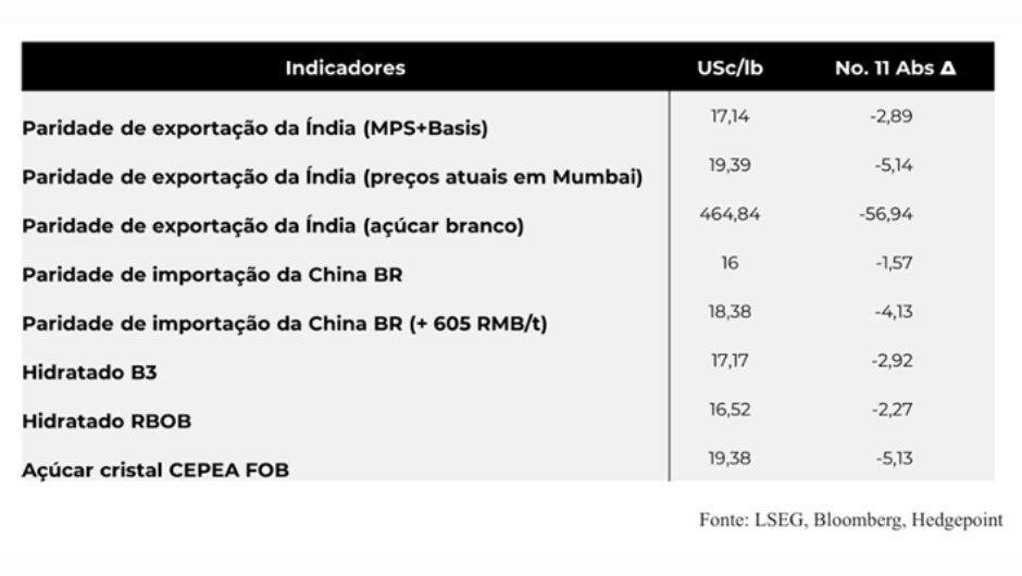 Mas, de acordo com análises feitas pela Hedgepoint Global Markets, o Brasil não será o único país a contribuir para o abastecimento global, à medida que nos aproximamos da época de colheita para o Hemisfério Norte. Na região, as expectativas continuam positivas para os principais produtores. “Na Tailândia, as condições climáticas favoráveis durante o desenvolvimento da safra reforçam nossa estimativa de produção de açúcar de cerca de 10 Mt. No entanto, o clima continua sendo monitorado, assim como a intensidade e os possíveis efeitos do fenômeno La Niña, principalmente no que diz respeito ao ritmo de colheita”, afirma Laleska.