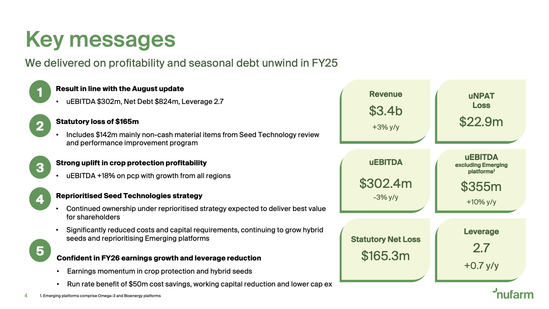 A Nufarm encerrou o ano fiscal de 2025 com lucro operacional de AU$ 302,5 milhões. O resultado, embora 3% inferior ao do ano anterior, ficou em linha com a previsão divulgada em agosto. A empresa reduziu a dívida líquida em AU$ 538 milhões no segundo semestre e projeta encerrar 2026 com alavancagem de 2,0.