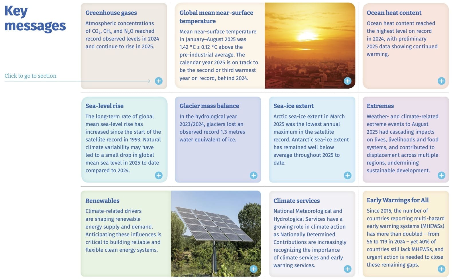 O calor oceânico também subiu, superando os níveis de 2024. Mais de 90% da energia excedente gerada pelo efeito estufa é absorvida pelos oceanos. Isso intensifica tempestades, acelera o derretimento polar e contribui para a elevação do nível do mar. Entre 2016 e 2025, o ritmo médio de aumento do nível do mar dobrou, atingindo 4,1 mm por ano.
