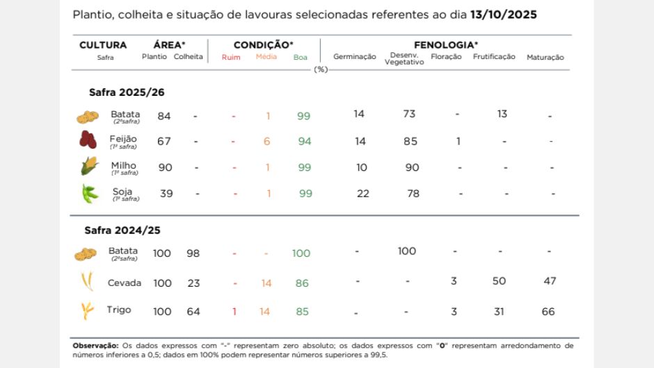 As lavouras de trigo estão em fase final de colheita, mas as chuvas recorrentes têm prejudicado a qualidade dos grãos, com relatos de queda no pH e aumento do volume de produto fora de padrão. Na cevada, a frutificação evolui positivamente, embora a umidade elevada tenha favorecido a incidência de doenças fúngicas.