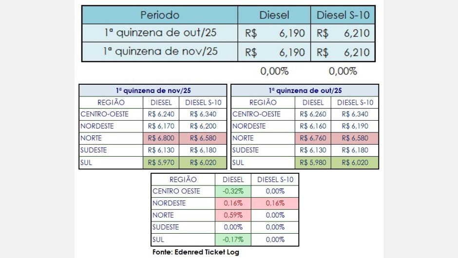 De acordo com a mais nova análise do Índice de Preços Edenred Ticket Log (IPTL), levantamento que consolida o comportamento de preços das transações nos postos de combustível, o diesel comum e o S-10 apresentaram estabilidade em seus preços médios nacionais na primeira quinzena de novembro, em comparação com o mesmo período de outubro. O tipo comum foi encontrado em média por R$ 6.19, e o S-10, a R$ 6,21.