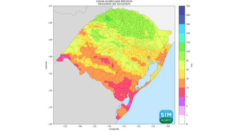 Os acumulados de precipitação previstos variam entre 10 e 100 milímetros. Nas áreas centrais e do norte, os volumes podem superar os 100 mm em pontos isolados, enquanto no extremo sul os totais tendem a ser menores, não ultrapassando 50 mm.