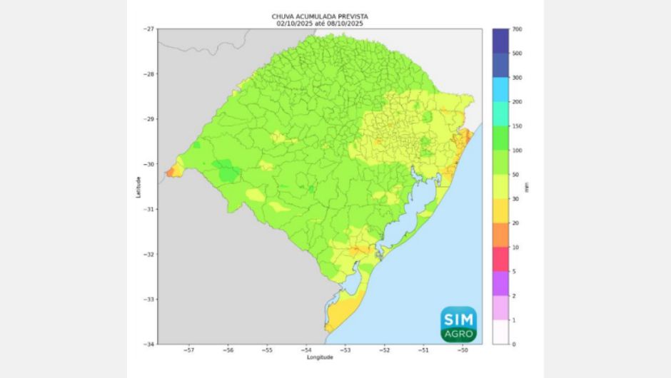 De acordo com o boletim, os volumes de chuva devem variar, em geral, entre 30 e 100 milímetros na maior parte do Estado. Em áreas isoladas da Fronteira Oeste, os acumulados podem ultrapassar os 100 milímetros. Já nas regiões Nordeste e Sudeste, a expectativa é de chuvas mais fracas, com totais que não devem passar dos 50 milímetros.