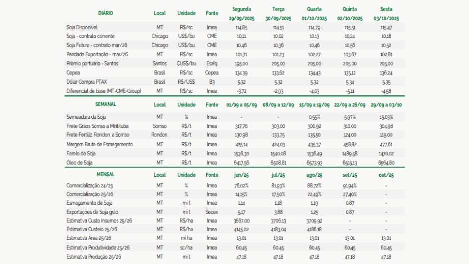 No balanço de oferta e demanda, o Imea reduziu as exportações da safra 2024/25 em 0,97%, para 30,50 milhões de toneladas, e manteve projeção de queda também para o próximo ciclo, com 29,33 milhões de toneladas previstas. Em contrapartida, o consumo interno do estado cresceu 0,32%, alcançando 13,03 milhões de toneladas, impulsionado pela ampliação da capacidade de esmagamento. Os estoques finais caíram 32,42%, refletindo o ritmo mais acelerado de escoamento da oleaginosa.