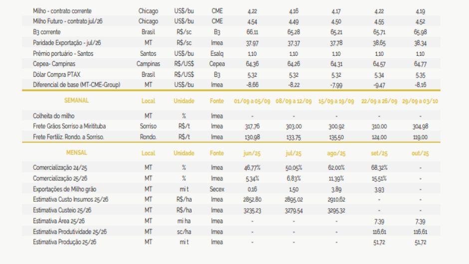 Mesmo diante da leve desvalorização semanal de 0,36% nos preços internos, o milho mantém bom desempenho econômico. O VBP do cereal deve alcançar R$ 40,39 bilhões em 2025, alta de 20,33% ante 2024, o que representa 19% da composição do VBP total do estado.