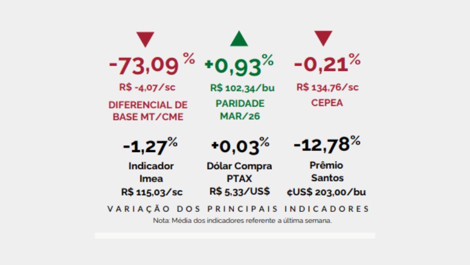 Apesar da leve alta de 0,93% no preço de paridade de exportação para março/26, o mercado de soja tem sido pressionado por prêmios menores e pela queda de 73% no diferencial de base MT/CME, segundo o instituto.