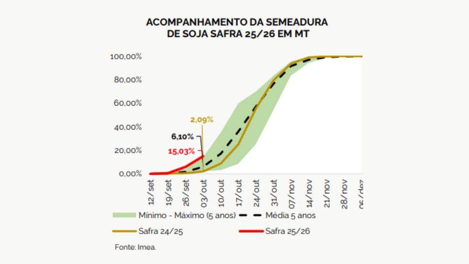 Até o dia 3 de outubro, a semeadura da soja 2025/26 atingiu 15,03% da área prevista em Mato Grosso, avanço de 9,06 pontos percentuais em uma semana e ritmo acima da média dos últimos cinco anos. As chuvas irregulares, no entanto, levaram parte dos produtores a interromper o plantio em algumas regiões, especialmente onde as temperaturas seguem elevadas.