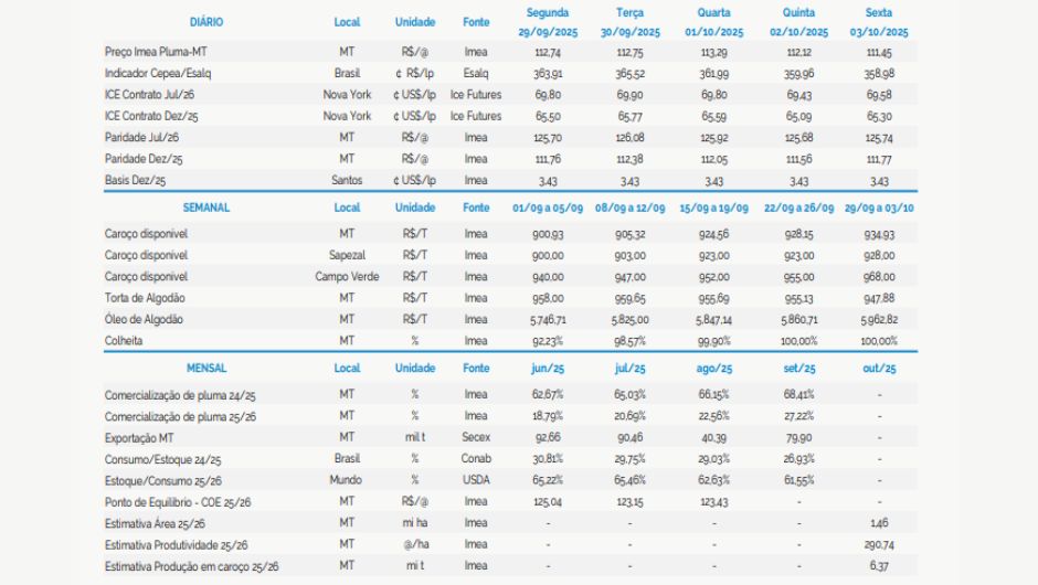 No mercado, o preço da pluma caiu 1,02% na semana, sendo cotado a R$ 112,47 por arroba, pressionado pela maior disponibilidade do produto e pela queda nas cotações internacionais. Em contrapartida, o óleo de algodão valorizou 1,74%, sustentado pela forte demanda das indústrias de biocombustíveis no estado.