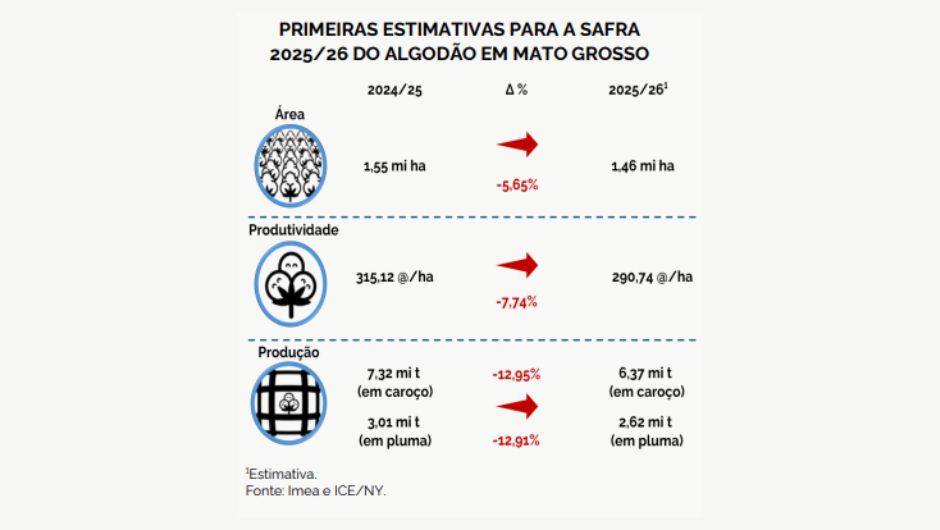 O primeiro levantamento do Imea para o algodão 2025/26 aponta redução de 5,65% na área plantada, que deve totalizar 1,46 milhão de hectares. O recuo é explicado pela tendência baixista dos preços e pelo aumento dos custos de produção, o que tem levado produtores a direcionar parte das áreas para o milho de segunda safra.