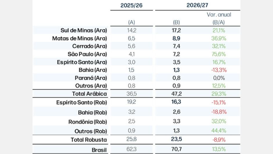 A StoneX, empresa global de serviços financeiros, divulgou sua 1ª estimativa para a safra brasileira de café 2026/27, apontando para uma produção total de 70,7 milhões de sacas, um avanço de 13,5% em relação ao ciclo anterior (2025/26), sendo 47,2 milhões de sacas de arábica (aumento anual de 29,3%) e 23,5 milhões de sacas de robusta (recuo de 8,9%). Apesar da recuperação esperada, o volume ainda está abaixo do potencial máximo que poderia ser atingido em condições climáticas ideais.