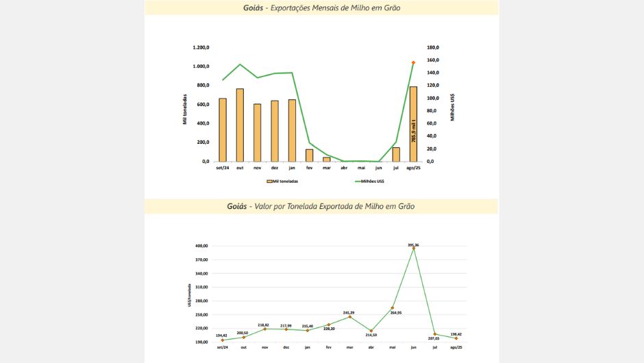 Enquanto o Brasil registrou retração no faturamento e no volume exportado de milho e seus derivados entre janeiro e agosto de 2025, Goiás seguiu na contramão, com aumentos de 49,1% em valor e 44,6% em volume.