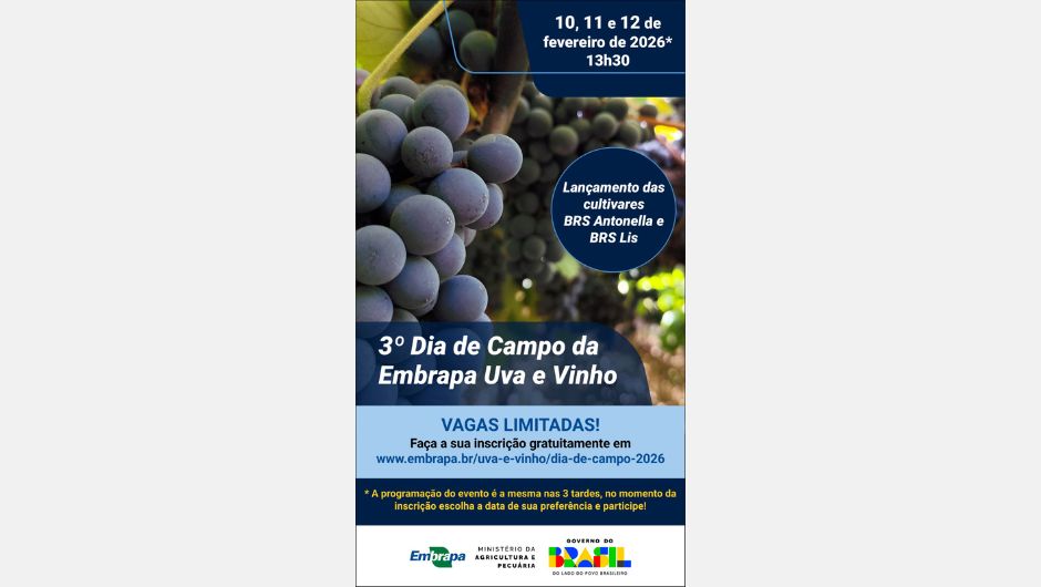 Estão abertas as inscrições para o 3º Dia de Campo Institucional da Embrapa Uva e Vinho, que será realizado nas tardes dos dias 10, 11 e 12 de fevereiro de 2026, na sede da Unidade, em Bento Gonçalves (RS). A programação será a mesma nos três dias e tem como público-alvo produtores, técnicos, estudantes e interessados no setor vitivinícola brasileiro. As inscrições são gratuitas e podem ser realizadas diretamente na página do evento (www.embrapa.br/uva-e-vinho/dia-de-campo-2026).