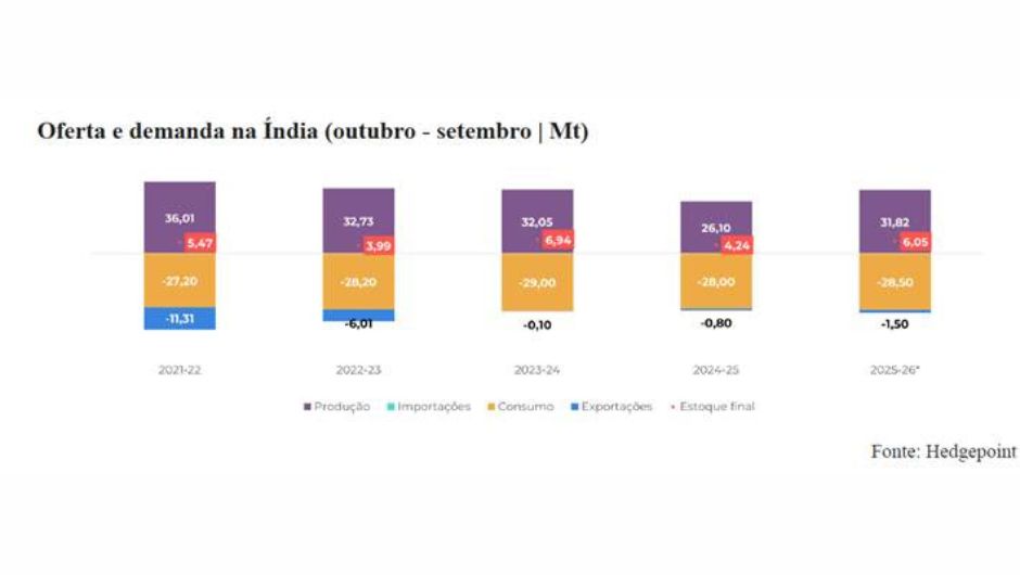 “A diferença entre os preços internos e internacionais fecha completamente a arbitragem. Hoje, não há incentivo econômico para o produtor indiano exportar volumes adicionais”, destaca.