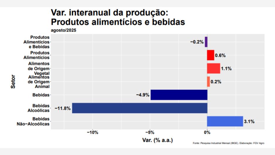 Em agosto, os setores que mais contraíram foram: Bebidas (-4,9%) e Produtos Não-Alimentícios (-4,2%), ambos acumulam quedas sucessivas ao longo do ano. No setor de Bebidas, as alcoólicas sofreram uma redução em sua produção de 11,8%, atingindo o menor nível desde 2014. Vale ressaltar que os casos de contaminação por metanol ocorreram em setembro, após o período analisado pela pesquisa.