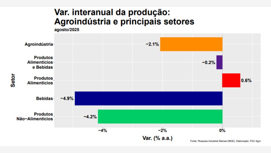 O volume de produção da Agroindústria registrou queda de 2,1% em agosto ante o mesmo mês do ano passado. No acumulado do ano, a retração é de 0,5%, de acordo com os dados da pesquisa sobre o Índice de Produção Agroindustrial (PIMAgro) do FGVAgro.