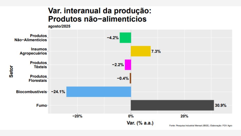 No segmento de Produtos Não Alimentícios, a contração foi derivada, principalmente, da queda na produção de Biocombustíveis (-24,1%), o pior resultado para o mês desde o início da série histórica em 2003.