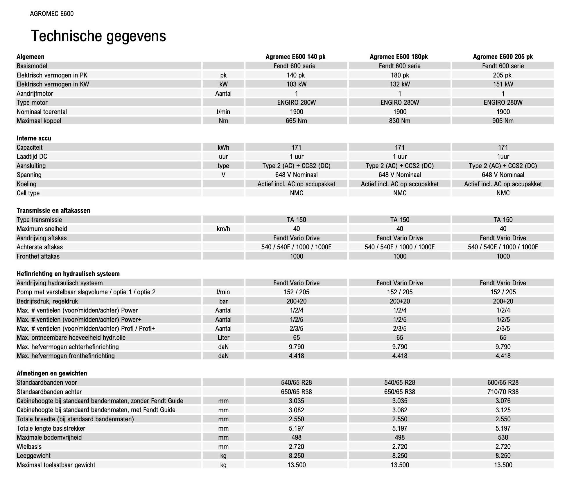 A Agromec divulgou detalhes do Agromec E600, um trator totalmente elétrico baseado na plataforma Fendt 600 Vario. A máquina entra no segmento de tratores elétricos de média e alta potência. Está prevista para ser oferecida em 2026 na Holanda.