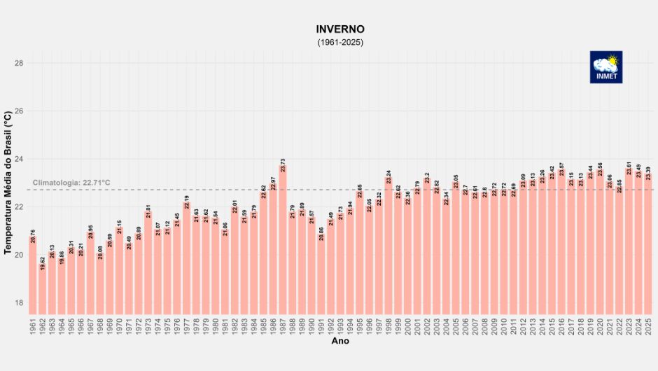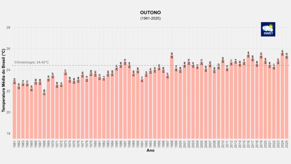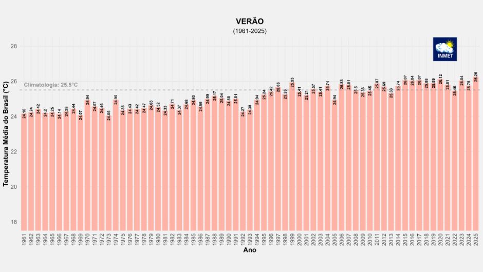 Com base nas observações registradas desde 1961 nas estações meteorológicas do Instituto Nacional de Meteorologia (Inmet) em todo o Brasil, a temperatura média anual do país em 2025 foi de 24,56 °C, 0,33 °C acima da média. Esse valor posiciona 2025 como o sétimo ano mais quente da série histórica brasileira, considerando o período de 1961 a 2025. O ano mais quente no Brasil continua sendo 2024, com temperatura média de 25,02 °C, valor 0,79 °C acima da média.