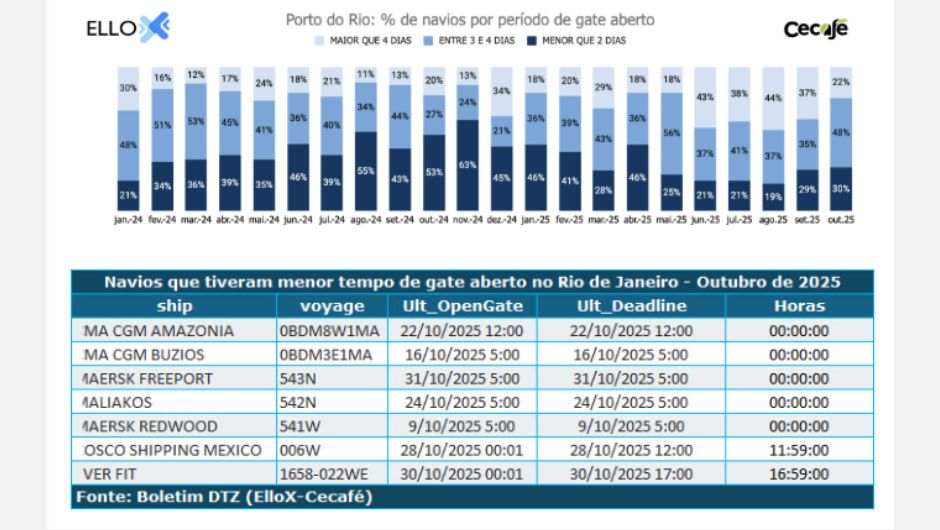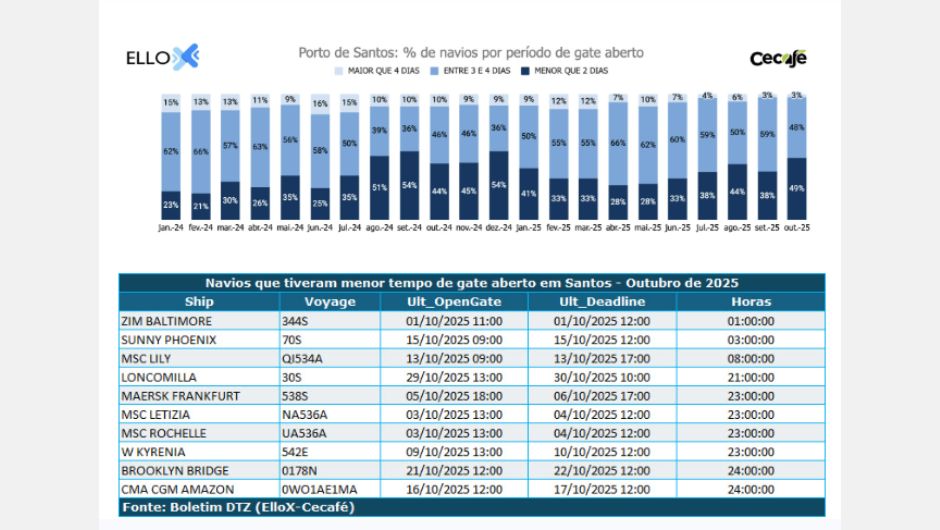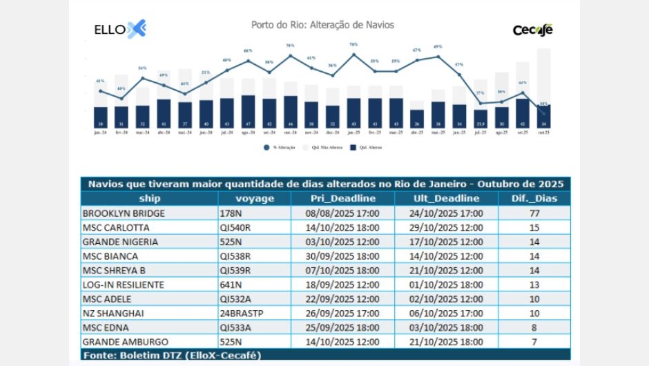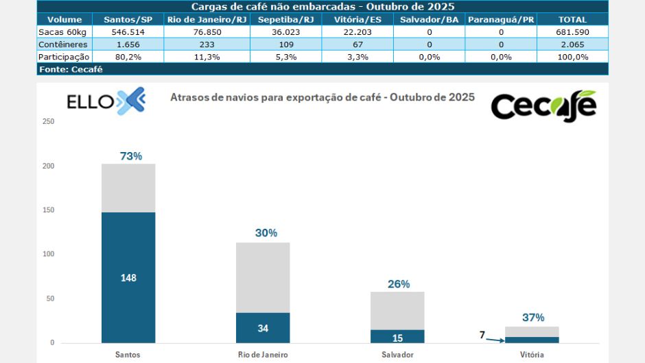 Em outubro de 2025, 52% dos navios, ou 204 de um total de 393 embarcações, tiveram atrasos ou alteração de escalas nos principais portos do Brasil, conforme o Boletim DTZ, elaborado pela startup ElloX Digital em parceria com o Cecafé.