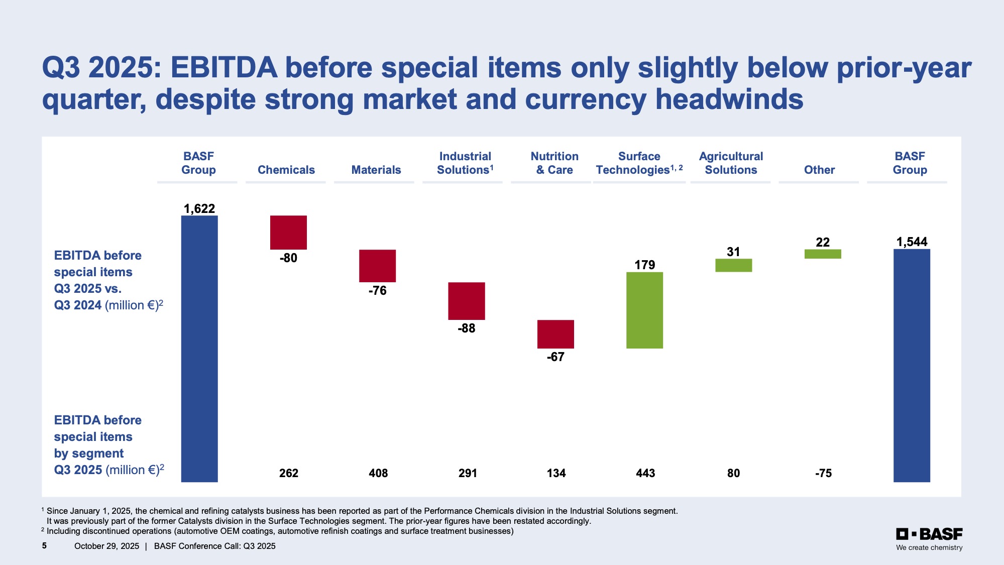 O EBITDA antes de itens especiais somou € 1,4 bilhão, ligeiramente abaixo dos € 1,5 bilhões registrados no terceiro trimestre de 2024. A margem EBITDA manteve-se em 10%, igual à do ano anterior. A queda no lucro operacional reflete desempenho mais fraco nos segmentos de Soluções Industriais, Químicos, Materiais e Nutrição & Cuidados. Já os segmentos de Tecnologias de Superfície e Soluções Agrícolas registraram aumentos expressivos na lucratividade.