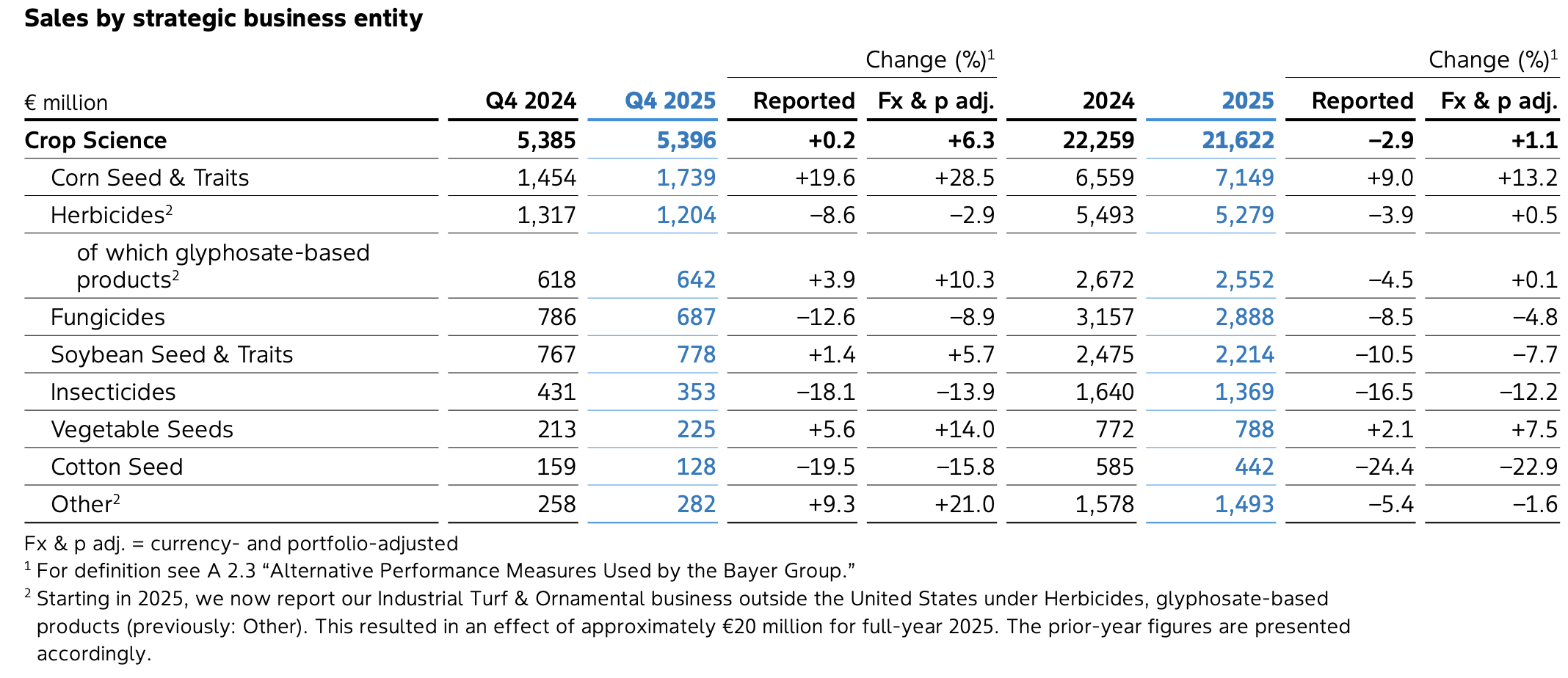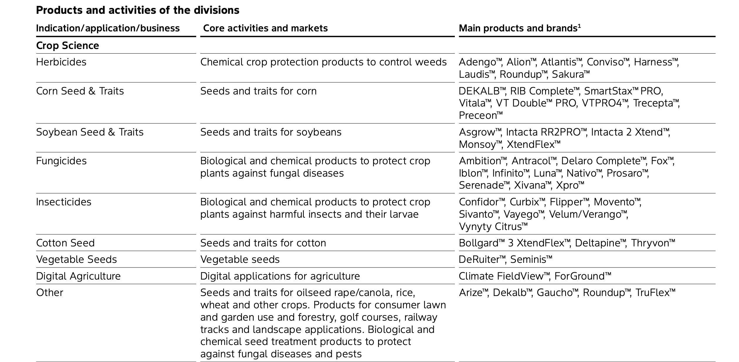 Fungicidas recuaram 4,8%, com queda na América do Norte e Ásia-Pacífico. Inseticidas diminuíram 12,2%, após expiração do registro de Movento (espirotetramato) na Europa. Sementes e traits de soja caíram 7,7%. Algodão recuou 22,9%. A empresa relacionou o desempenho à anulação do registro de produtos à base de dicamba nos Estados Unidos.