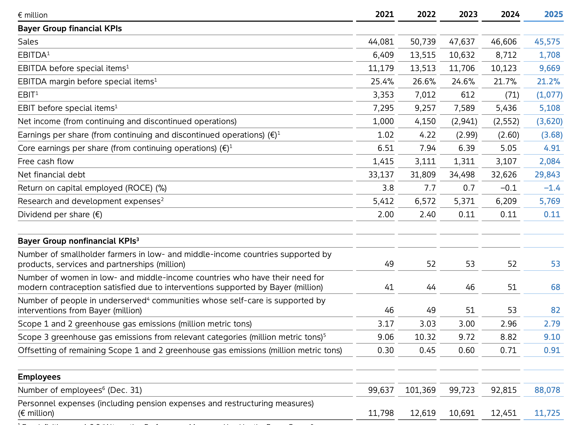 Para 2026, a Bayer projeta crescimento entre 0% e 3% nas vendas globais, na base ajustada por câmbio e portfólio. O EBITDA antes de itens especiais deve variar entre 9,6 bilhões e 10,1 bilhões de euros. O fluxo de caixa livre deve ficar negativo entre 1,5 bilhão e 2,5 bilhões de euros, com desembolso de cerca de 5 bilhões de euros ligado a litígios.