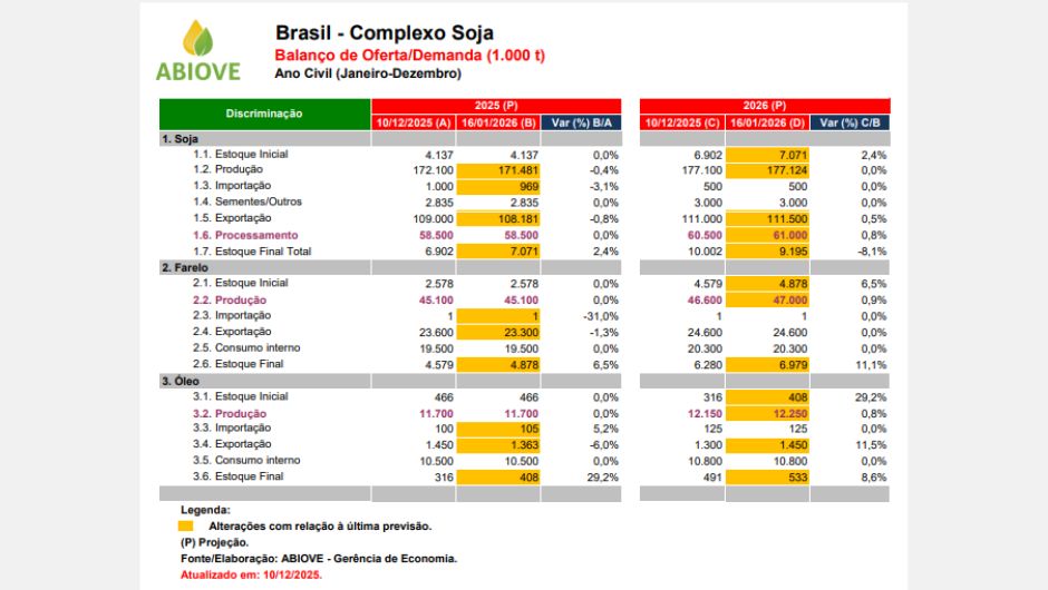 A Associação Brasileira das Indústrias de Óleos Vegetais (Abiove) atualizou suas projeções para o complexo soja, evidenciando o protagonismo do processamento interno. O grande destaque do novo balanço é a expectativa de que o esmagamento de soja no Brasil alcance o patamar recorde de 61 milhões de toneladas em 2026, representando um aumento de 0,8% em relação à estimativa anterior.