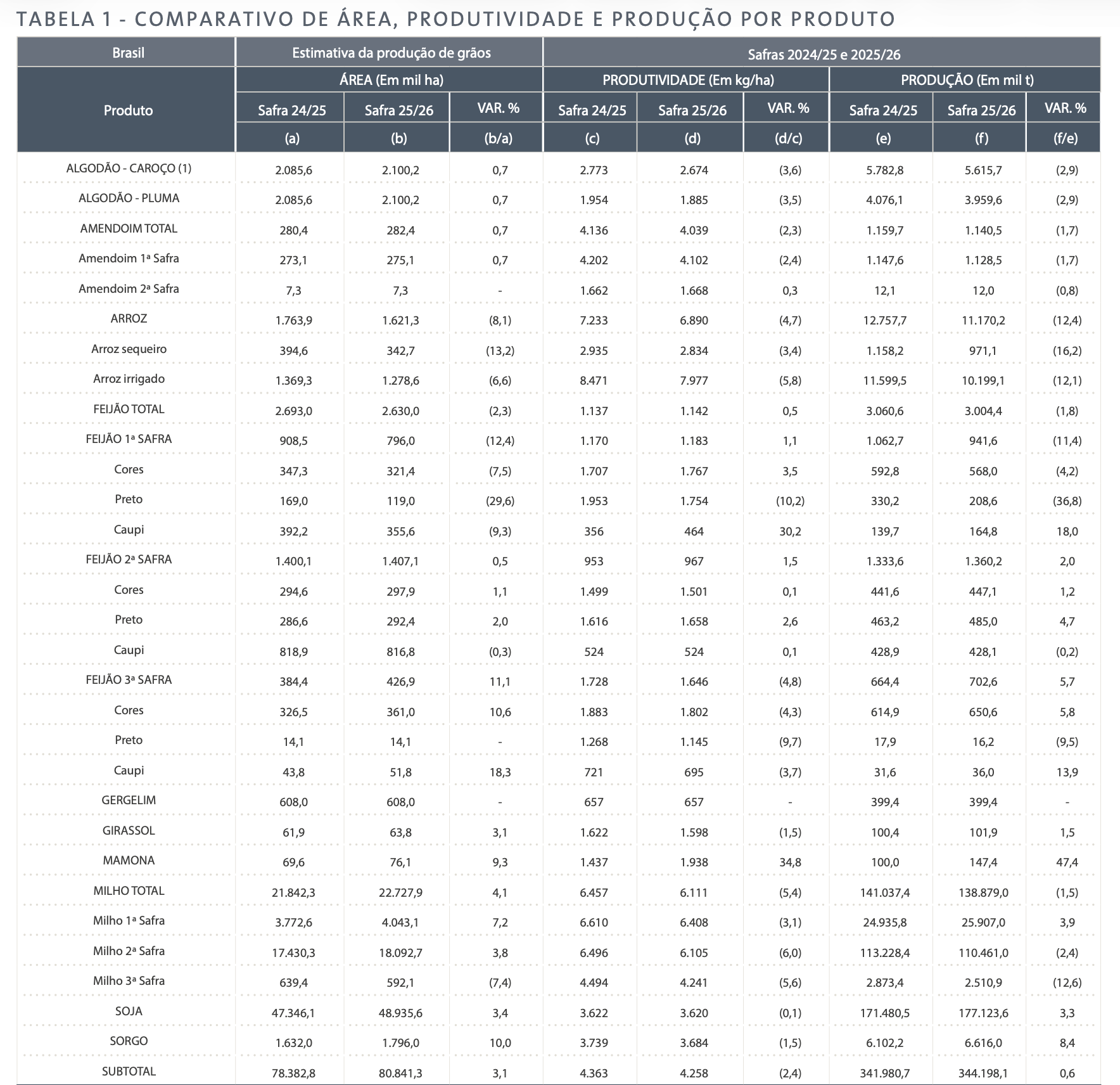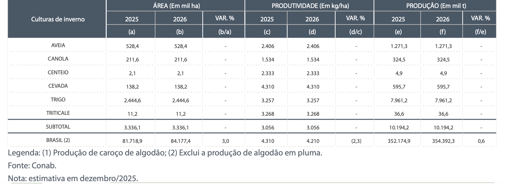 O volume recua pouco mais de 440 mil toneladas ante a projeção anterior. O corte reflete ajustes após o avanço da semeadura e mudanças no comportamento climático. A Conab destaca o fim da colheita das culturas de inverno de 2024/25, que apresentou produtividade maior que a da temporada passada. Esses resultados compõem agora a estimativa para 2025/26.