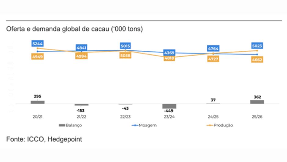 “O posicionamento dos fundos em cacau segue cauteloso, em consonância com o ambiente macroeconômico mais incerto. Os preços vinham reagindo principalmente a fatores técnicos, refletindo ajustes do mercado. Nos últimos dias, entretanto, a atualização dos preços pagos ao produtor em Gana e na Costa do Marfim estimulou um maior ritmo de entregas, acrescentando pressão de oferta ao mercado e contribuindo para a correção observada nesta semana”, explica Carolina França, analista de inteligência de mercado da Hedgepoint Global Markets.