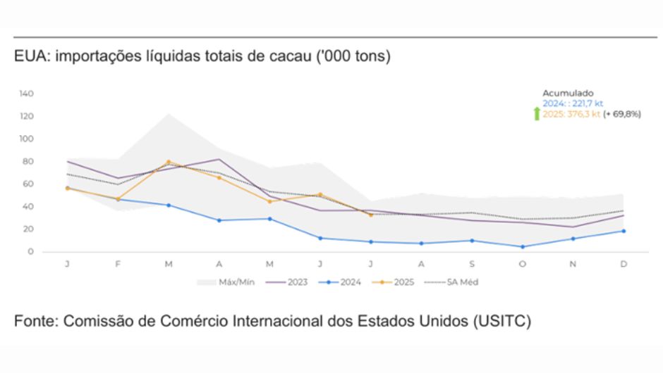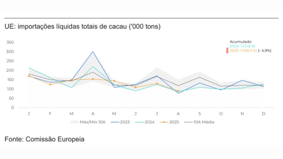 Na União Europeia, o quadro é distinto. O acumulado líquido ainda está quase 5% abaixo do ano anterior, embora a diferença tenha diminuído em relação ao início de 2025. A preferência por amêndoas africanas de maior qualidade mantém o custo elevado, já que Costa do Marfim e Gana possuem diferenciais maiores em comparação a outras origens.