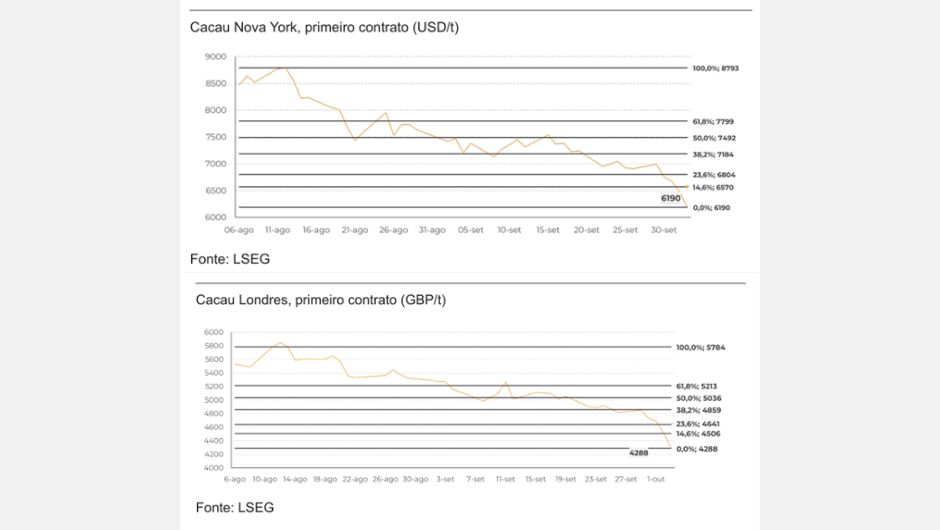 Após terem atingido o menor patamar em um ano, os contratos de Cacau mais próximos encerraram a semana de 3 de outubro cotados a 6.190 USD/t em Nova York e 4.288 GBP/t em Londres, acumulando reduções semanais superiores a 10%. Na avaliação da Hedgepoint Global Markets, alguns fatores atualmente movimentam o mercado, conforme destaques a seguir:
