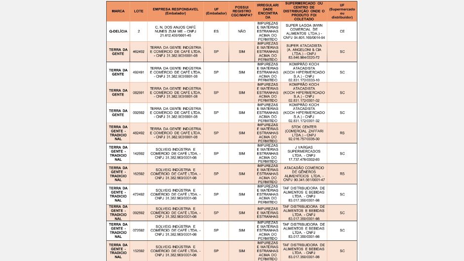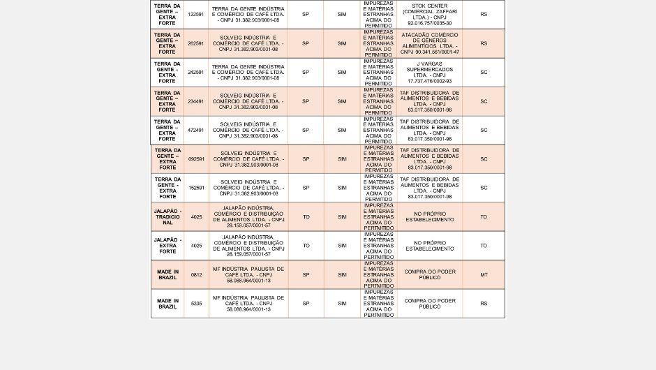 As irregularidades foram constatadas a partir de exames realizados pelos Laboratórios Federais de Defesa Agropecuária (LFDA). Entre as marcas envolvidas estão produtos distribuídos nos estados do Ceará, Santa Catarina, Rio Grande do Sul, Tocantins e Mato Grosso, como Q-Delícia, Terra da Gente, Jalapão e Made in Brazil. A relação completa de marcas e lotes pode ser consultada na tabela abaixo.