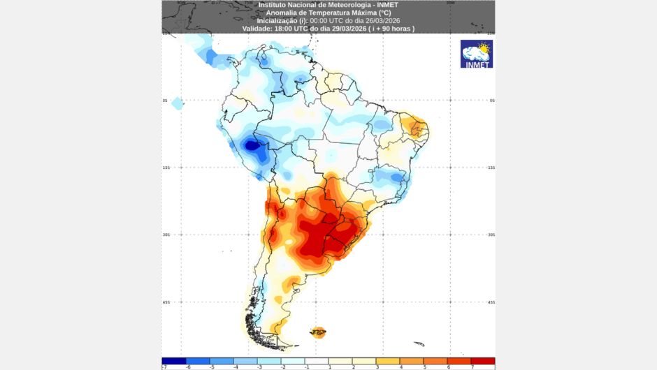 Esse episódio de calor está associado à atuação de um sistema de alta pressão sobre a região, especialmente entre os dias 27 e 30 de março. Esse sistema desfavorece a formação de nuvens, aumentando a incidência de radiação solar e, consequentemente a elevação das temperaturas. Em áreas do Rio Grande do Sul e de Santa Catarina, o deslocamento desse sistema contribuirá para a manutenção de condições de estabilidade atmosférica, sustentando esse cenário até a segunda-feira (30), quando o sistema começa a se afastar para oeste, reduzindo gradualmente sua influência e, consequentemente, as anomalias de temperaturas.
