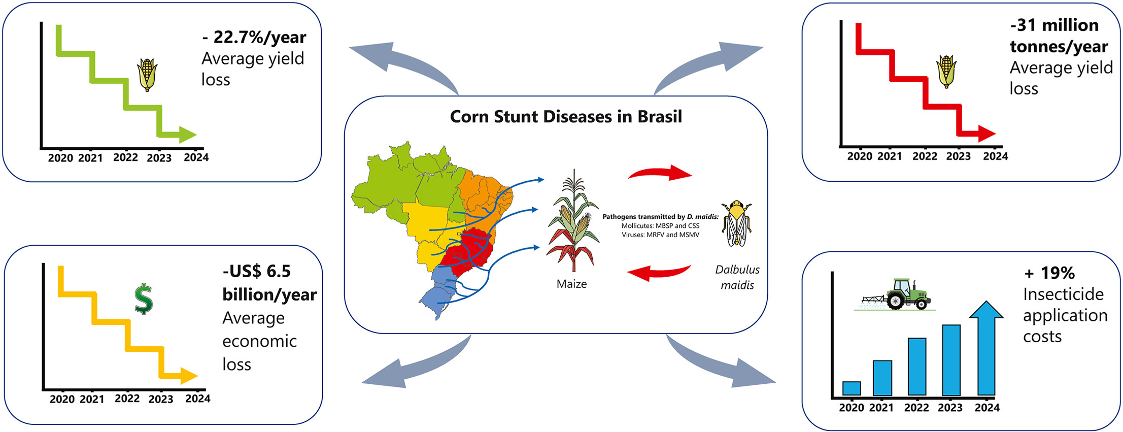 O trabalho identifica o enfezamento como a maior ameaça fitossanitária da cadeia do milho no país. O complexo envolve dois patógenos restritos ao floema. O fitoplasma do enfezamento-vermelho (maize bushy stunt phytoplasma). O espiroplasma do enfezamento-pálido (corn stunt spiroplasma). Ambos dependem da cigarrinha Dalbulus maidis para transmissão.