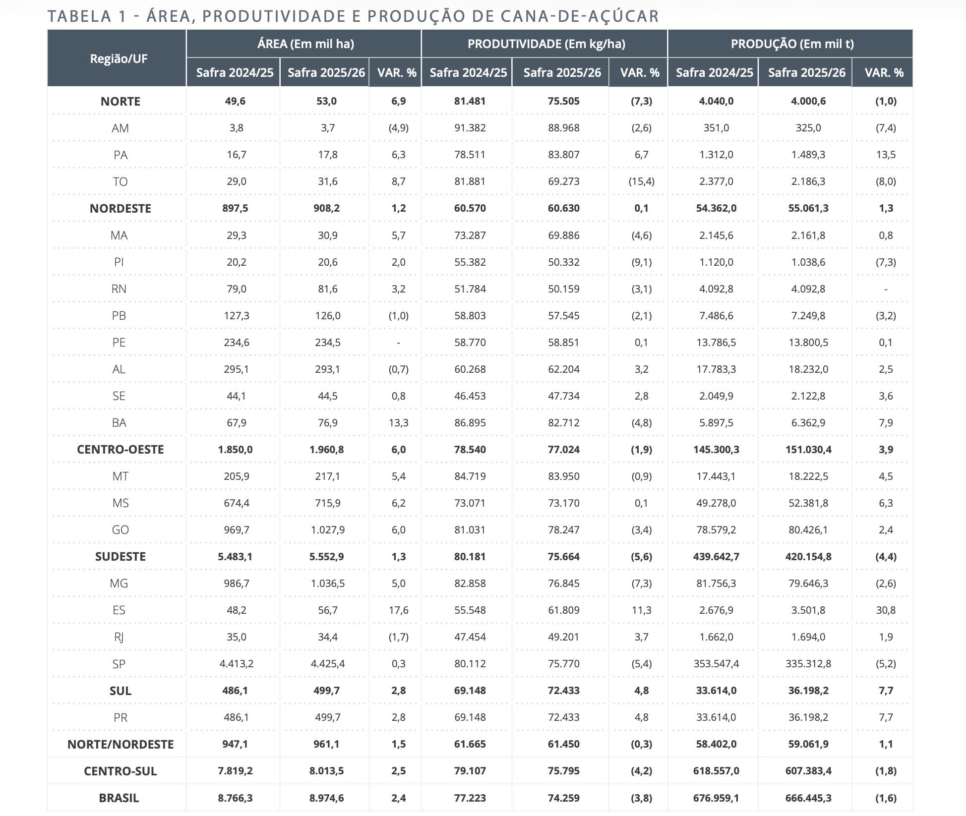 No Nordeste, a colheita deve alcançar 55,1 milhões de toneladas, alta de 1,3%. A produtividade segue estável em 60.630 quilos por hectare. Já no Sul, as chuvas favoreceram o avanço da safra. A Conab projeta aumento de área e produtividade, com produção de 36,2 milhões de toneladas, 7,7% acima da temporada anterior.